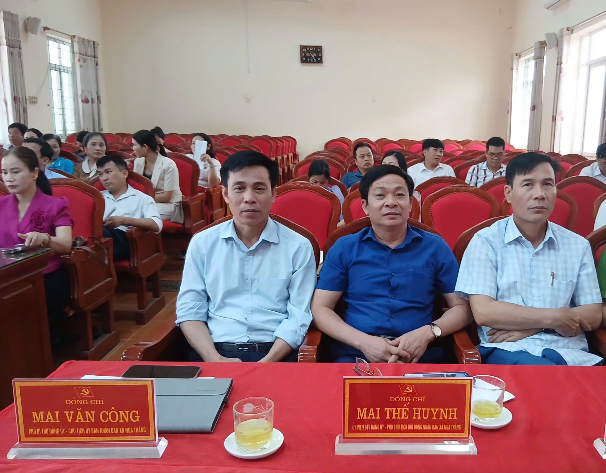 Tại điểm cầu xã Nga Thắng, dự và chủ trì có đồng chí Trịnh Văn Tiến – Bí thư Đảng ủy, Chủ tịch HĐND xã; đồng chí Phạm Văn Thành, Phó bí thư Thường trực Đảng ủy xã; đồng chí Mai Văn Công – Phó Bí thư Đảng ủy, Chủ tịch UBND xã. Tham dự hội nghị còn có các đồng chí trong Ban Thường vụ Đảng uỷ, Ủy viên Ban Chấp hành Đảng bộ xã; Trưởng các Phòng ban, ngành, đoàn thể; Trưởng các tổ chức chính trị - xã hội; Giám đốc, Phó Giám đốc Trung tânm Cung ứng DVC- Hành chính công; các đồng chí Hiệu trưởng các khối trường học đóng trên địa bàn xã cùng cán bộ, công chức có liên quan.